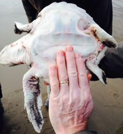 'The animal had an almost empty stomach, with only a bit of gelatinous matter - possibly jellyfish remains - and one fine plastic fiber as you would get from rope. Tissue samples and the shell have been saved for further analysis. There was no obvious cause of death by obstruction, desease, or injury. The top of ridges of the shell were damaged but could have happened as the turtle was swept up on rocks at the Rossnowlagh beach'.