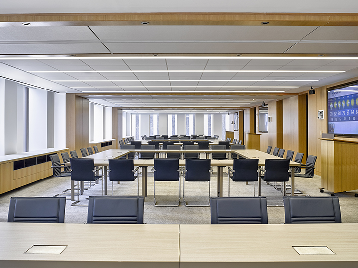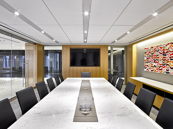 That custom furniture included eight marble or glass conference tables featuring rift cut white oak bases and 16 credenzas featuring marble and/or glass, rift cut white oak and polished stainless steel. The credenzas align the walls of the meeting spaces providing essential storage and countertop space.