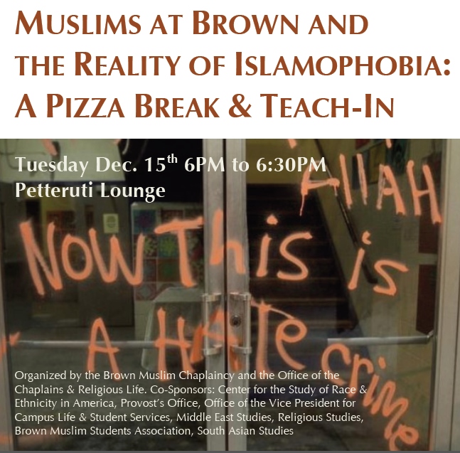 The Brown Muslim Chaplaincy and the Office of the Chaplains and Religious Life have organized a teach-in on Tuesday, December 15 as a campus-wide gathering to express compassionate support of our Muslim students, faculty and staff. We know from members of the Brown Muslim community that anti-Muslim rhetoric across the country is creating a climate of fear for many. Tuesday's event at 6:00 p.m. in Petteruti Lounge of the Robert Campus Center is titled "Muslims at Brown and the Reality of Islamophobia: A Pizza Break & Teach-In." It will offer a showing of the film "American Muslims: Fact vs. Fiction," with an opportunity for attendees to discuss the film over pizza.