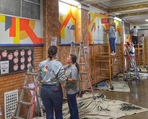 Some parents had requested to discretely place a facility on or near the fields to accommodate the sports and teams that use the fields and Parks and Recreation is planning to accommodate those requests. __________________________ Artist Hamilton Glass, Altria, and Students Create Artistic Walls at Albert Hill The Hill Family teamed up with local artist Hamilton Glass, Altria employee volunteers, and students to help make Albert Hill a better and more artistic place! The crews worked to add some colorful art to the walls and spur creativity and aspirations among students using art as the teaching tool.