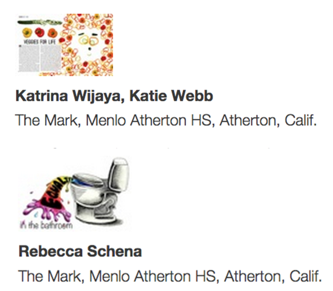 The finalists are Katrina Wijaya and Katie Webb for Design of the Year and Rebecca Schena as a Cartooning Award Finalist. The three finalists have all graduated from M-A. Wijaya is off to UCLA, Webb is off to Brown, and Schena is on her way to RISD. I am so proud of them, and so lucky to have had them on staff.