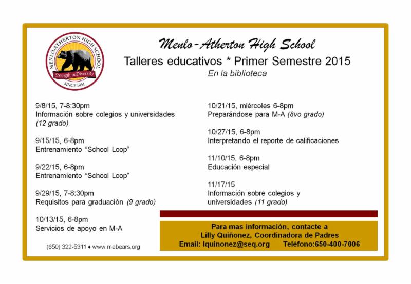 Invitamos a los padres de familia a asistir a los talleres educativos de 6 a 8pm los días 13 (Servicios de Apoyo en M-A) , 21 (Preparándose para M-A - 8 grado) y 27 de octubre (interpretación del reporte de calificaciones). Así como el 10 (Educación Especial) y el 17 de Noviembre (La importancia de asistir a la escuela - 9 grado) en la biblioteca de M-A. Para más información, contacte a Lilly Quiñonez, Coordinadora de Padres. Iquinonez@seq.org Teléfono: 650-400-7006. |