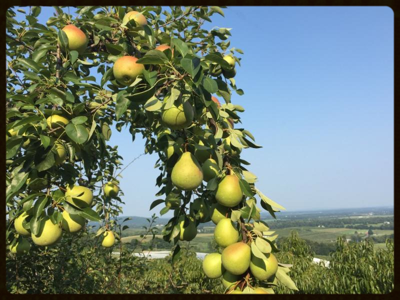 So I guess that we had it right all along when we discovered the variety many years ago and put in our first planting, with which we had a lot of trouble. The most recent, relatively, planting was on a dwarfing rootstock; and we have the best crop ever. While we don't have a huge crop the pears are as pretty as a Magness can get, not bright yellow like a Bartlett, they are kind of a tan or "russet" color, as it is called in the trade. A bit more mellow than the extreme russeting which Bosc can exhibit, being quite smooth with a greenish to tan skin, often with a bronze blush where the sun hit the fruit. Don't expect them to turn a bright color; the pears will have to be gently squeezed to detect when they are ripe and ready to eat. The Magness is a cross between two great varieties, both of which have their shortcomings. Seckel, a wonderful, superbly sweet, but tiny, pear, never seemed to "take off" in the U.S., perhaps due to its diminutive size. The Comice, a fine European pear, is unfortunately very susceptible to "Fire Blight" a scary, orchard destroying bacterial infection, which we once had in our planting of Jonathan apples; which, by the way, goes to explain why you seldom see Jonathan anymore. We had to pull out the whole orchard, and burn it, away from any fruit trees. Needless to say we never replanted the variety. But, back to the Magness; the good doctor was looking to breed a fine pear with the rich flavor of both the Seckel and Comice, but without the faults exhibited. He did a fine job, as the Magness is pretty large, and the tree is very fire blight resistant. The flesh, when sufficiently ripe, is meltingly sweet, soft, grit free, and delicious. The tree does, however, have some drawbacks, which is why it is seldom found. As it happens, the variety wants to bear biennially, meaning that it will often have a huge crop of little pears one year, and the next it may put on only a handful of overly large pears, not a financially viable trait. While you can go out and hand thin some fruit in the "heavy" crop year, it isn't easy, and not always very satisfactory. We've known more than a few growers who raised them for a number of years, only to pull out the orchard after a couple of especially tough seasons. We have our small planting as we just love the fruit, and figure we can afford, thank you, to put aside enough ground to raise a few. Another reason why few growers raise pears is that you want to get a return on what is now a large investment, putting in a modern high density orchard, and pears just want to take their own good time growing, the tree itself, not the pear. The old adage heard around here, Adams County, Pennsylvania, is "plant pears for your heirs". The slow growth habit of pear trees is one of the reasons why we, and other growers, plant trees upon which the scion, or varietal wood, is grafted onto dwarfing rootstock. For some reason the pear and peach breeding industries are having a great deal of difficulty coming up with good dwarfing rootstocks, whereas there are a plethora of good versions for apple trees. We have, however, a pretty successful version, at least this year, of dwarf Magness.