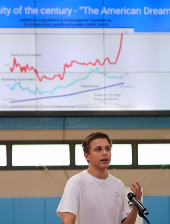 At Community Life on May 7th, Upper School students and faculty were treated to presentations of exceptional academic work. Students nominated by their teachers spoke about a variety of creative projects including an art piece depicting a literary character's internal experience, a self-designed China trip itinerary composed in Chinese, an in-depth examination of the causes of the Great Recession, a cinematic interpretation of Walt Whitman's poetry, and more. For their nominations, faculty members selected student work that reflected creativity, strong understanding, thorough execution and exceptional attention to detail.