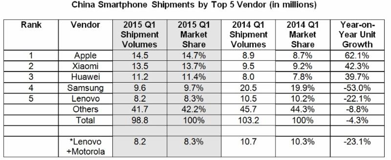 New IDC data shows iPhone surging and Samsung slipping in China. Samsung's share fell 53% in the past year, while Apple's grew 62%, mostly due to sales of iPhone 6 and 6 Plus.