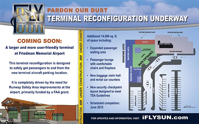 Friedman Memorial Airport's terminal reconfiguration project will be implemented throughout the winter and spring season, with expected completion in June 2015. This includes a 15,333 sq ft terminal addition as well as a rennovation of parts of the existing terminal.