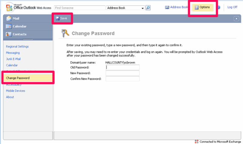 There are two easy ways to change your Hall County e-mail/network password. The first method is easiest for County employees who work on a computer. The second method is for those employees who primarily access their County e-mail.