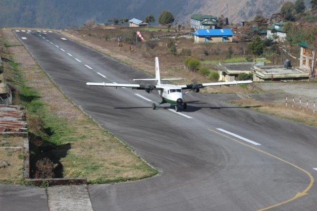 We took Tara Air from Kathmandu to Lukla. When you arrive at the domestic terminal in Kathmandu it's a bit like a shed, with crowds of tourists, locals, staff and supplies for the mountains. As we waited for our flight; all the scenic flights were announced as "cancelled" due to poor visibility" and we did not know what to think. Suddenly our flight is called and we are rapidly ushered to a very small aircraft, maximum of 14 passengers and the engines start and then stop "Lukla is closed" they announced, so off we get, back on the bus to the terminal, no wait, the bus turns around "Lukla is open" and we are on our way. They offer you cotton wool and sweets as the vibrations can be quite loud. The flight is an amazing 25 minutes of the most scenic countryside I have ever seen and then there's the "landing" - there is much excitement, nerves and anticipation. The pilot lands without a hitch, off loads us and sets off again to collect more trekkers and supplies from the capital.
