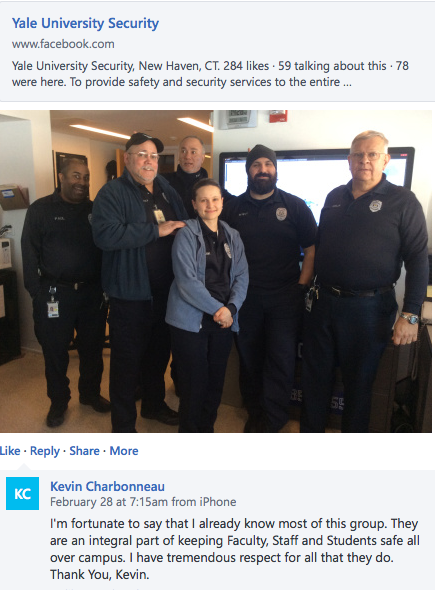 Yammer is a private social network designed to help departments and/or teams stay in touch. Yale Yammer has many followers and recently in an effort to boost our Security Facebook numbers this photo was posted. In addition to increased likes on Facebook, Environmental Health & Safety Manager Kevin Charbonneau wrote these very kind words. Thanks Kevin! |