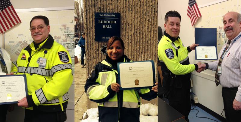 Late last fall the Security Operations Managers got together to develop a program that recognizes excellence and above-average performances in the officer ranks. The new Yale Security Officer Appreciation Certificate Program recognizes performances that go above standard operating procedures. Quite often, managers receive emails or letters of thanks from departments telling of a circumstance when an officer went above and beyond their normal duties to help someone in distress, or defuse a tense situation or even change a flat tire! The managers felt strongly that these individuals should be recognized for their outstanding performance. Each letter or email is vetted by the directors and other managers to insure it meets the program parameters. Once approved, a certificate is printed with the person's name, placed in a frame and presented to the officer during roll call with a copy of the letter or email. "Doing the mini-ceremony during roll call has bolstered morale," says Security Manager Reggie Chavis. "This program shows that we value our officers," he continued. Officers in all three shifts have received certificates including: - Gloria Colon