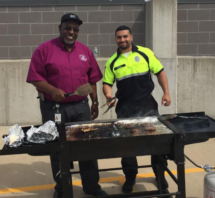 | 1st Annual Shift Appreciation BBQ! Security Manager Reggie Chavis (L) with a little help from Officer Noel Cordero grilled lots of meats and some vegetable burgers for all three 2nd-shift crews. He cooked for several hours feeding 50 grateful officers!