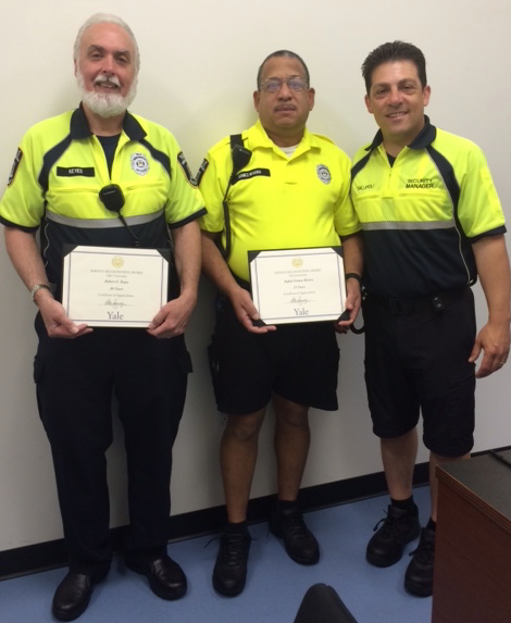 | LtoR Security Officers Robert Keyes and Rafael Gomez-Rivera celebrated anniversaries with Yale this summer (30 and 15 years). Security Manager Paul Gallipoli (R) congratulates them for their many years of great service.