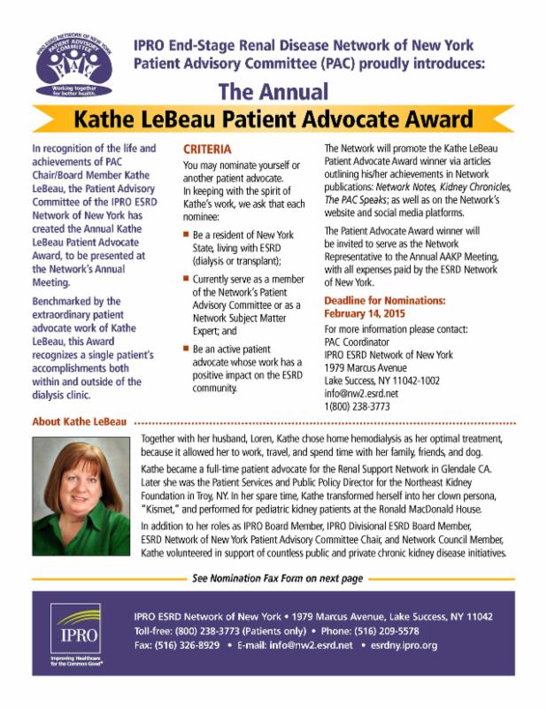 In recognition of the life and achievements of PAC Chair/IPRO Board Member Kathe LeBeau, the Patient Advisory Committee has created the Annual Kathe LeBeau Patient Advocate Award, to be presented at the Network's Annual Meeting (April 15, 2015 in Garden City, NY).