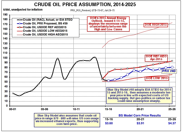 How Does This Compare with USDA's Baseline Forecast? PRX is higher by at least 50-75 cents, and we think rightly so--or "logically so." As far as we can determine, the USDA baseline does not connect corn price with crude oil price directly, but instead with smooth trends of the global economy. This ignores, in our view, the existence of a 15-billion gallon corn ethanol processing industry, which (in its own profit-seeking interest) will export corn ethanol if world crude oil prices are high enough (in the range, as we guess, of $70-$80 per barrel).