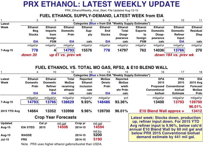 EIA Weekly Data: For the latest week of 7-Aug-15, ethanol production was 14.793 billion gallons annualized, up 61 mil gals from the previous week--and with a weekly residual error of 270 mil gals. Refiner Input was 13.766 bil gals annualized, down 184 mil gals from last week, and the calculated inclusion rate for the 138.629 bil gals of MoGas receiving ethanol was 9.93%. About 93.36% of all MoGas (with 148.486 bil gals annualized) did indeed receive ethanol. Ethanol stocks were down 30 mil gals. Page 2 has the 2015 year-to-date average of annualized ethanol production at 14.664 bil gals vs. EIA's latest August STEO forecast of 14.506 bil gals up 123 mil gals from last months forecast. Page 3 has OPIS's 2015 Friday RIN prices finally changing direction, moving up a few cents, but the gains appear to be fading with this weeks prices. Page 4 has Nebraska Group 3 ethanol margins falling 3 cents last week to 31.6 cents.