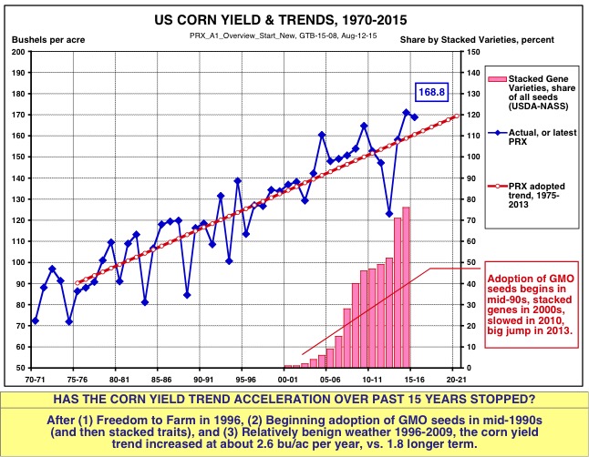 The USDA-NASS Crop Production report released yesterday indicated a US corn yield of 168.8 bushels/acre. This is 2 bu/acre higher than the trend adjusted yield from July. Additionally, the soybean yield was increased nearly 1 bushel/acre. Although soybean planted and harvested acreages were lowered, the higher yield more than offset that decrease.