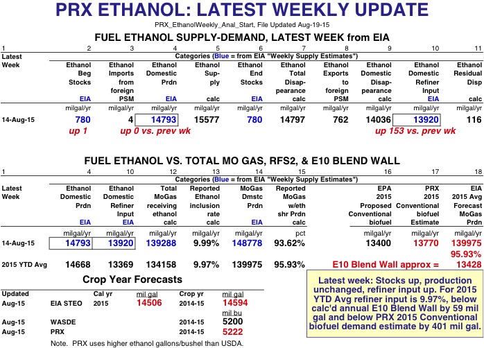 EIA Weekly Data: For the latest week of 14-Aug-15, ethanol production was 14.793 billion gallons annualized, unchanged from the previous week--and with a weekly residual error of 116 mil gals. Refiner Input was 13.92 bil gals annualized, up 153 mil gals from last week, and the calculated inclusion rate for the 139.288 bil gals of MoGas receiving ethanol was 9.99%. About 93.62% of all MoGas (with 148.778 bil gals annualized) did indeed receive ethanol. Ethanol stocks were up 1 mil gals. Page 2 has EIA's latest August STEO forecast of both ethanol and motor gasoline consumption increasing from last month to 14.506 & 14.483 bil gals of ethanol and 139.973 & 140.479 bil gals of motor gasoline in 2015 & 2016, respectively. Page 3 has OPIS's 2015 Friday RIN prices showing the D5/D6 RIN price spread holding around 24 cents, off its peak of 38 cents. EIA weekly data import data has failed to capture any ethanol coming into the US, but we should start to see in the July monthly data a few shipments of Brazilian ethanol coming onshore. Page 4 has Nebraska Group 3 ethanol margins increasing 6.3 cents last week to 37.9 cents.