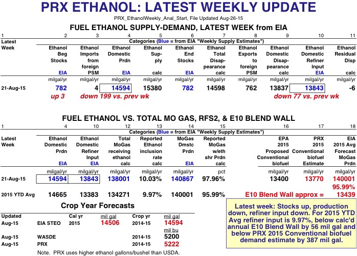 EIA Weekly Data: For the latest week of 21-Aug-15, ethanol production was 14.594 billion gallons annualized, unchanged from the previous week--and with a weekly residual error of -6 mil gals. Refiner Input was 13.843 bil gals annualized, down 77 mil gals from last week, and the calculated inclusion rate for the 138.001 bil gals of MoGas receiving ethanol was 10.03%. About 97.96% of all MoGas (with 140.867 bil gals annualized) did indeed receive ethanol. Ethanol stocks were up 3 mil gals. Page 2 has EIA's Petroleum Supply Monthly 2015 year-to-date ethanol export annualized average at 867 mil gals. The EIA weekly data does not publish an export number, so we're using the latest available monthly number to estimate weekly exports on page 1. Page 3 has OPIS's 2015 Friday RIN prices all falling and the D5/D6 RIN price spread continuing to decline. This spread should continue to decline and return back to normal levels when EPA hopefully issues its Final Rule in November. Page 4 has weekly ethanol production declining slowly over the past two months now and the EIA is forecasting the next few months of production to continue declining, but staying above 14 bil gals annualized.