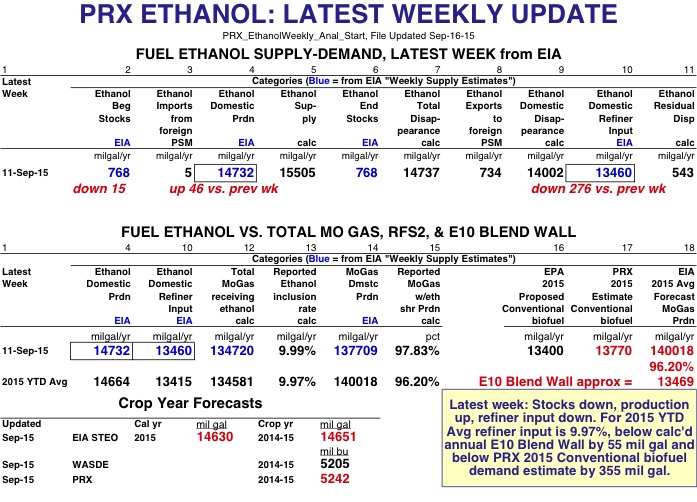 EIA Weekly Data: For the latest week of 11-Sept-15, ethanol production was 14.732 billion gallons annualized, up 46 mil gals from the previous week-and with a weekly residual error of 543 mil gals. Refiner input was 13.460 bil gals annualized, down 276 mil gals from last week, and the calculated inclusion rate for the 134.581 bil gals of mogas receiving ethanol was 9.99%. About 97.83% of all mogas (with 137.709 bil gals annualized) did indeed receive ethanol. Ethanol stocks were down 15 mil gals. Under crop year forecasts, the USDA WASDE has updated their 14-15 corn to ethanol use up by 5 mil bushels to 5.205 bil bushels, while PRX has a slightly higher forecast of 5.242 bil bushels. Page 2 has the 2015 YTD annualized weekly product supplied of finished motor gasoline at 140.018 bil gals, which is in line with the Sept-STEO forecast of motor gasoline consumption at 139.919 bil gals. The STEO team is also forecasting 2016 mogas consumption at 140.304 bil gals. Page 3 has OPIS's 2015 Friday RIN prices all falling again and it appears the market is expecting the final rule for the 2014 & 2015 RVOs to not be binding, as production numbers are up for most renewable fuels. For the first seven months of 2015, over 9.79 million RINs have been generated (adjusting for errors, non-compliance, & exports) and if this pace continues over 16.78 million RINs will be generated in 2015. Page 4 has weekly ethanol production up for the first two weeks of September and could be higher than the STEO's Sept monthly forecast, which annualized is 14.399 bil gals.