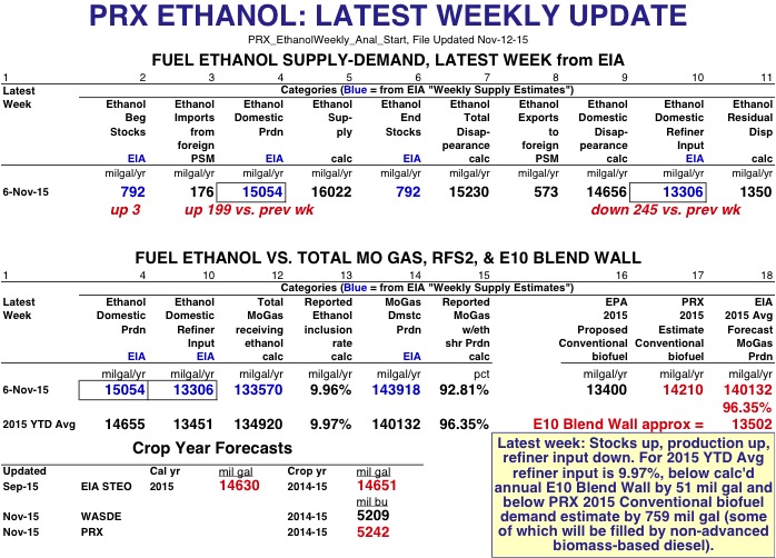 EIA Weekly Data: For the latest week of 6-Nov-15, ethanol production was 15.054 billion gallons annualized, up 199 mil gals from the previous week-and with a weekly residual error of 1.35 bil gals. Refiner input was 13.306 bil gals annualized, down 245 mil gals from last week, and the calculated inclusion rate for the 133.57 bil gals of mogas receiving ethanol was 9.96%. About 92.81% of all mogas (with 143.918 bil gals annualized) did indeed receive ethanol. Ethanol stocks were up 3 mil gals to 792 mil gals.