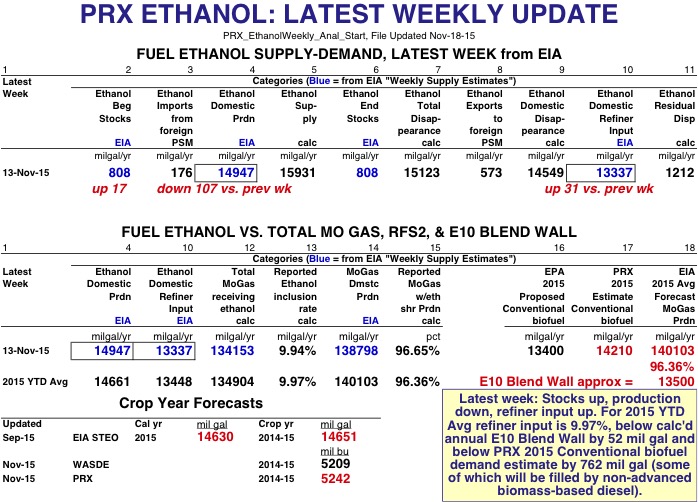 EIA Weekly Data: For the latest week of 13-Nov-15, ethanol production was 14.947 billion gallons annualized, down 107 mil gals from the previous week--and with a weekly residual error of 1.212 bil gals. Refiner input was 13.337 bil gals annualized, up 31 mil gals from last week, and the calculated inclusion rate for the 134.153 bil gals of mogas receiving ethanol was 9.94%. About 96.65% of all mogas (with 138.798 bil gals annualized) did indeed receive ethanol. Ethanol stocks were up 17 mil gals to 808 mil gals.