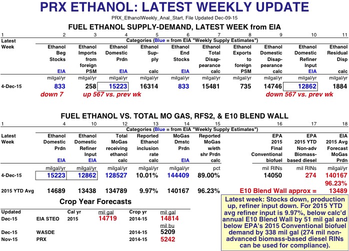 EIA Weekly Data: For the latest week of 4-Dec-15, ethanol production was 15.223 billion gallons annualized, up 567 mil gals from the previous week--and with a weekly residual error of 1.884 bil gals. Refiner input was 12.862 bil gals annualized, down 567 mil gals from last week, and the calculated inclusion rate for the 128.527 bil gals of mogas receiving ethanol was 10.01%. About 89% of all mogas (with 144.409 bil gals annualized) did indeed receive ethanol. Ethanol stocks were down 7 mil gals to 833 mil gals.