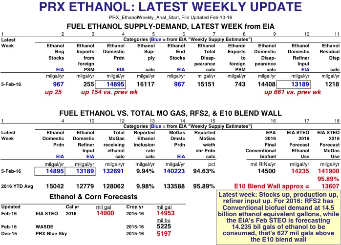 EIA Weekly Data: For the latest week of 5-Feb-16, ethanol production was 14.895 billion gallons annualized, up 154 mil gals from the previous week--and with a weekly residual error of 1.218 bil gals. Refiner input was 13.189 bil gals annualized, up 661 mil gals from last week, and the calculated inclusion rate for the 132.691 bil gals of mogas receiving ethanol was 9.94%. About 94.63% of all mogas (with 140.223 bil gals annualized) did indeed receive ethanol. Ethanol stocks were up 25 mil gals to 967 mil gals.