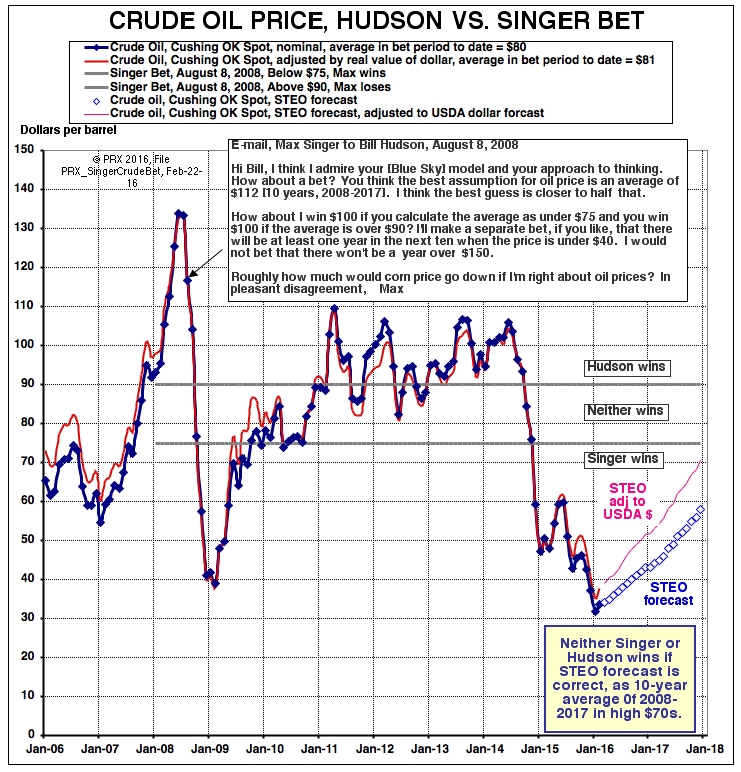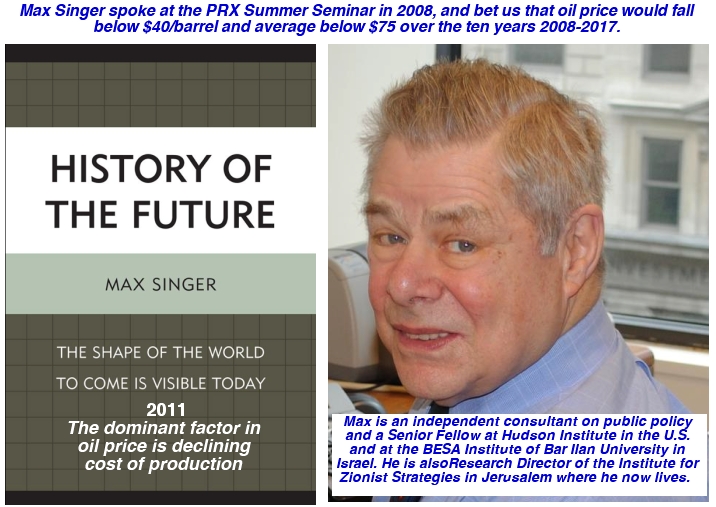The chart below gives the details of Max Singer's 2008 bet with me on the price of crude oil, in an e-mail I received shortly after his presentation to the August PRX Summer Seminar in Kansas City. Max had told our audience in a general way his view of cheaper energy prices ahead, but after his return home he quantified the details--and I have shared his ideas at least once a year since then.