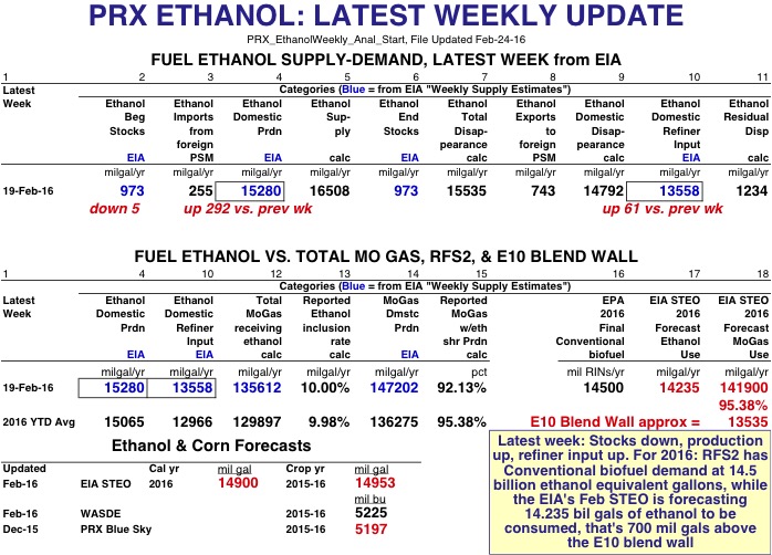 EIA Weekly Data: For the latest week of 19-Feb-16, ethanol production was 15.28 billion gallons annualized, up 292 mil gals from the previous week--and with a weekly residual error of 1.234 bil gals. Refiner input was 13.558 bil gals annualized, up 61 mil gals from last week, and the calculated inclusion rate for the 135.612 bil gals of mogas receiving ethanol was 10%. About 92.13% of all mogas (with 147.202 bil gals annualized) did indeed receive ethanol. Ethanol stocks were down 5 mil gals to 973 mil gals.