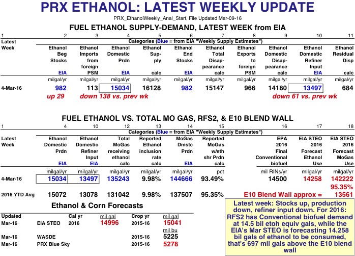 EIA Weekly Data: For the latest week of 4-Mar-16, ethanol production was 15.034 billion gallons annualized, down 138 mil gals from the previous week--and with a weekly residual error of 684 mil gals. Refiner input was 13.497 bil gals annualized, down from last week, and the calculated inclusion rate for the 135.243 bil gals of mogas receiving ethanol was 9.98%. About 93.49% of all mogas (with 144.666 bil gals annualized) did indeed receive ethanol. Ethanol stocks were up 29 mil gals to 982 mil gals.