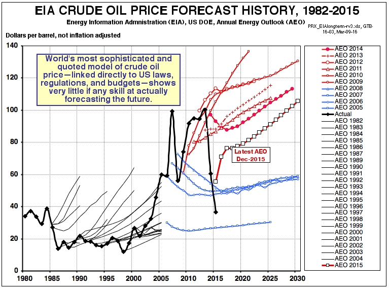 The original motto of PRX in 1988 was "New Approaches to Understanding World Grain Markets and US Agribusiness." But my colleague John Stewart had already begun along this route by himself in the 1970s with his discovery of the close correlation of US corn "feed and residual use" and US corn yield deviation from trend. Together we applied this discovery to state-by-state net corn exports, and adjusted animal feeding rates to reconcile net exports from the cornbelt states with net imports of users in the northeast, southeast, and west--using actual movement data. The PRX "state corn supply-demand system" has become more "commercially accurate" than any alternative. The system allowed us to go into realistic detail at the county level and below, using a satellite-based GIS we developed with NASA, and which we applied to grain elevator and corn dry mill origination volumes. Next came the ten-year forward extrapolation of all our regional details above, called the "PRX Blue Sky Model," incorporating the impact of all the new corn ethanol demand, and connected to China and our big export competitors in South America and the Black Sea. We called this new approach "blue sky" because we knew that academic economists would otherwise strenuously object. How can a mere 18 megabyte Excel file compare with the power of university-built programs millions of times larger? But we nonetheless believe the PRX Blue Sky is indeed a more powerful commercial forecasting tool, and this essay tells why. Hint #1: We accept the commercial need to go ahead and guess at the impossible variables--like oil price, exchange rates, and government policies. Hint #2: Have you noticed that the institutional models, despite their size and acclaim, don't seem to have much of a batting average? Could there actually be something wrong with their swings? See the track record of the USDOE below. Seminar registration still available until tomorrow March 15th: Register here.