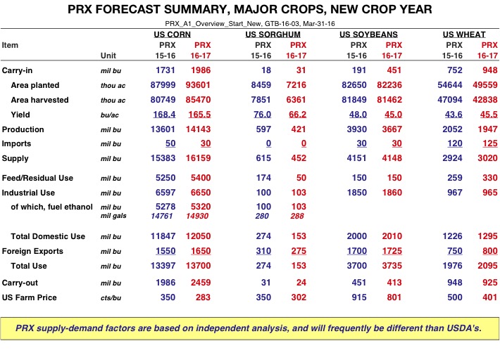 USDA released the March 1 Quarterly Stocks and Prospective Plantings reports yesterday. The stocks report held few surprises, but the prospective plantings were very impactful. Corn acreage was estimated at 93.601 million acres, up 6 percent from last year. The increase was across the cornbelt, but mostly in the western and central cornbelt states. Soybean acreage was estimated at 82.236 million acres, down 1 percent from last year. Wheat acres were estimated at 49.559 million acres, down 9 percent. Winter wheat was off 8 percent, spring wheat off 14 percent and durum up 3 percent. Sorghum acres were estimated at 7.216 million acres, off 15 percent. Spring weather will be a determining factor in actual acres. All other PRX reports will not be updated until the April 12th WASDE report.