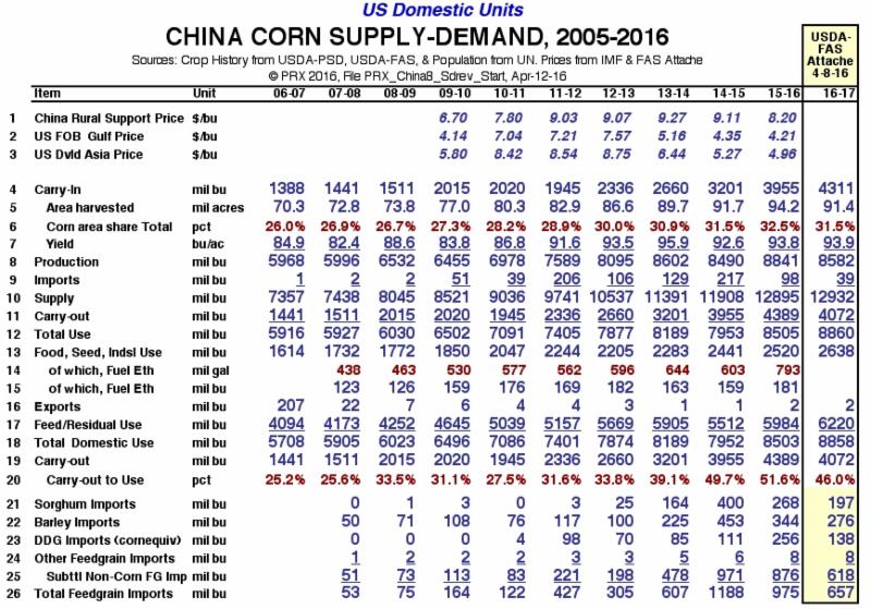 Below is the China Corn Supply-Demand Table with crop year 16-17 according to the Attache, and translated to domestic units of acres and bushels. (The WAOB will issue its own version of this and all other 16-17 tables on May 10, 2016.)