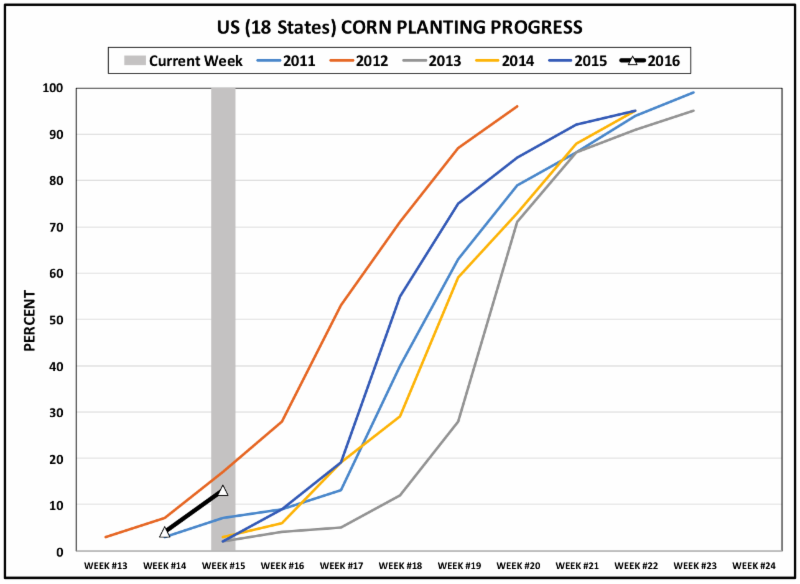 USDA-NASS Crop Progress report released April 18, 2016 shows 13 percent of corn acres planted. This is 6 percent more than 2015 and 5 percent more than the 2011-2015 average. Missouri continued to lead the way with 58 percent planted followed by Kansas at 35. Missouri is 34 percent greater than last year and 37 percent ahead of the 5 year average. Illinois, Iowa, Minnesota and Nebraska were at 12, 13, 13, and 7 percent respectively. No other states were above 1 percent planted.
