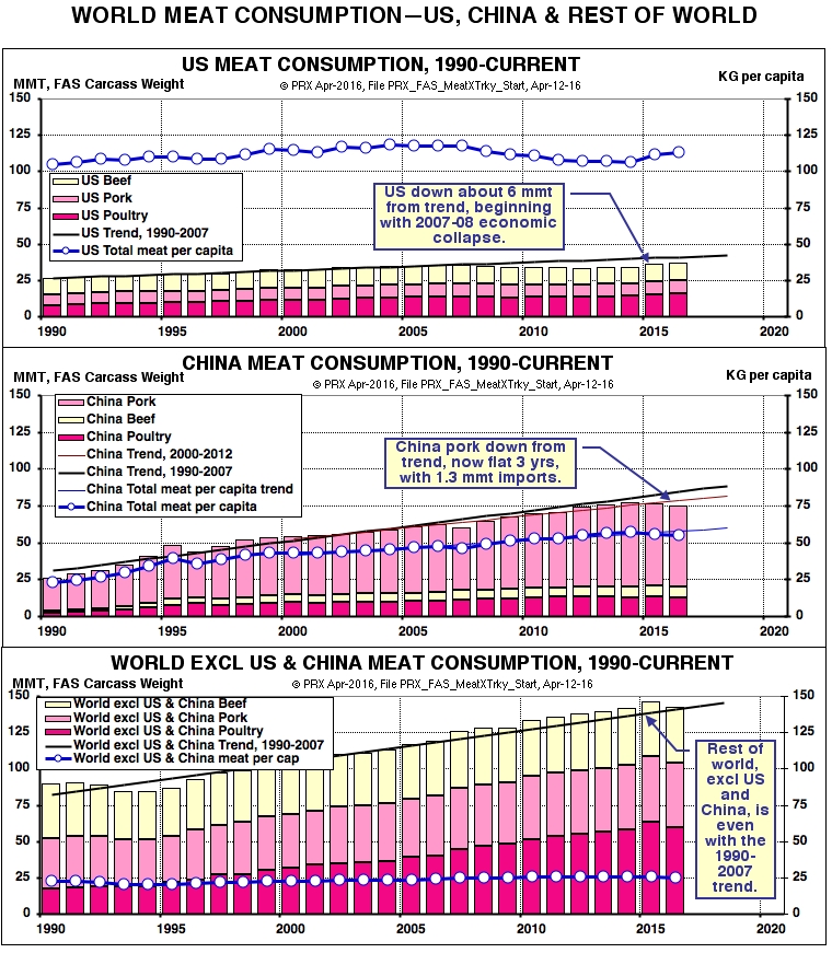 World consumption of beef, pork, and poultry in 2016 will total 253.6 million metric tons, carcass weight, per current USDA-FAS data. Of this, the United States accounts for 36.7 mmt, China for 74.7, and the Rest of the World excluding the US and China for 142.2 mmt.