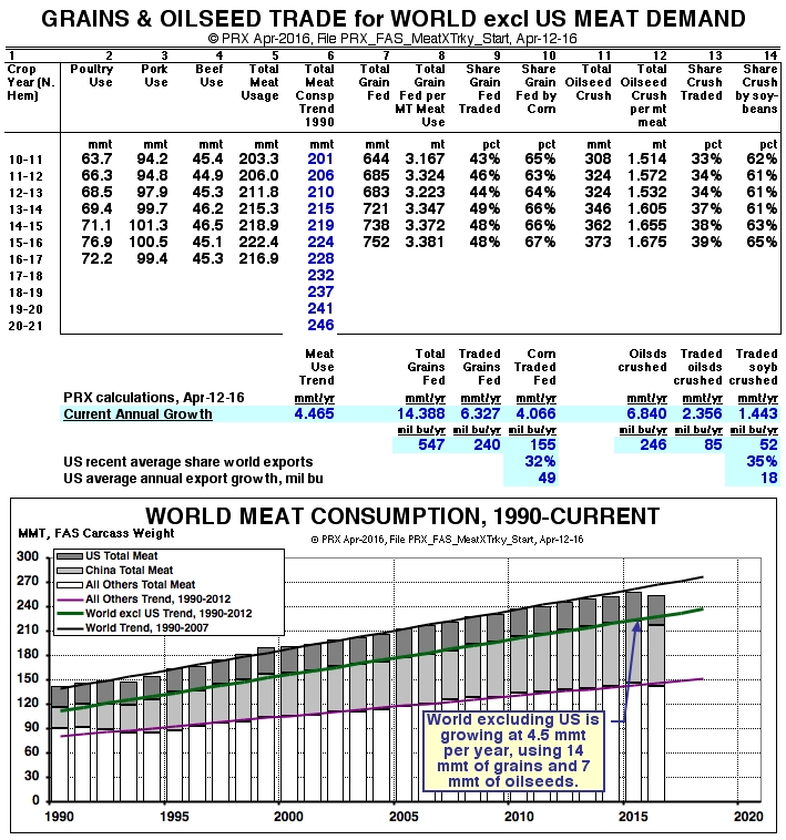 Below the table, highlighted in blue are the annual growth numbers for columns 8 to 10 and 12 to 14, in metric tons per year--and finally the conversion of the metrics to millions of bushels per year. Thus we calculate that meat demand outside the United States accounts for trade of about 155 million bushels of corn each years and 52 million bushels of soybeans.