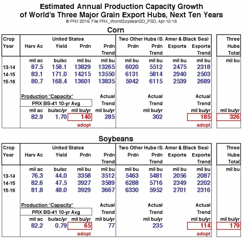 For soybeans, the Blue Sky #41 projection is 65 million bushels per year growth for the US, and 114 million bushels per year for the other two Hubs--or a three-Hub total of 179 million bushels.