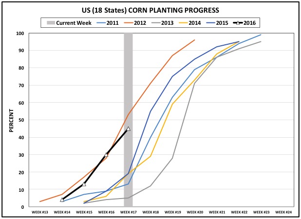 USDA-NASS Crop Progress report released May 2, 2016 shows 45 percent of corn acres planted. This is equal to 2015 and 15 percent ahead of the 2011-2015 average. Missouri continued to lead the way with 89 percent planted followed by Illinois which jumped to 66 percent, an increase of 24 percent. Large increases were also seen in Indiana and Ohio with increases of 19 percent. Iowa was close behind with an increase of 17 percent.