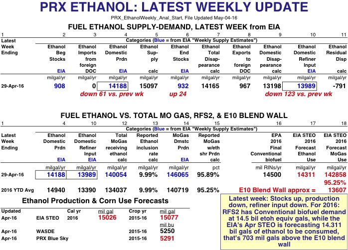 EIA Weekly Data: For the latest week ending 29-Apr-16, ethanol production was 14.188 billion gallons annualized, down 61 mil gals from the previous week--and with a weekly residual error of -791 mil gals. Refiner input was 13.989 bil gals annualized, down 123 mil gals from last week, and the calculated inclusion rate for the 140.054 bil gals of mogas receiving ethanol was 9.99%. About 95.89% of all mogas (with 146.065 bil gals annualized) did indeed receive ethanol. Ethanol stocks were up 24 mil gals on the week to 932 mil gals.