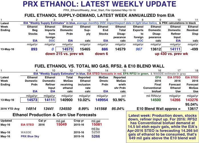 Page 2 has PRX's calculation using EIA's weekly estimates and DOC import/export data for the 2016 year-to-date annualized average of ethanol domestic disappearance at 13.947 bil gals vs EIA's May STEO forecast of 14.266 bil gals. Yet, EIA's 2016 YTD annualized average of weekly estimates of domestic refiner and blender net input of fuel ethanol is only 13.441 bil gals, leaving a residual disappearance of 507 mil gals.