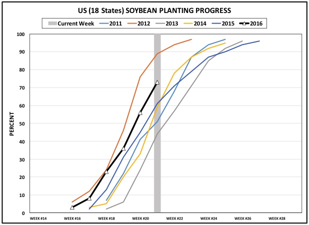 The report also shows 73 percent of soybean acres planted. This is 5 percent ahead of 2015 and 7 percent ahead of the 2011-2015 average. Kansas and Missouri lag behind at 26 and 59 percent respectively. Large increases in progress were seen in the eastern cornbelt with Indiana, Michigan, and Ohio increasing 32, 36, and 41 percent respectively.
