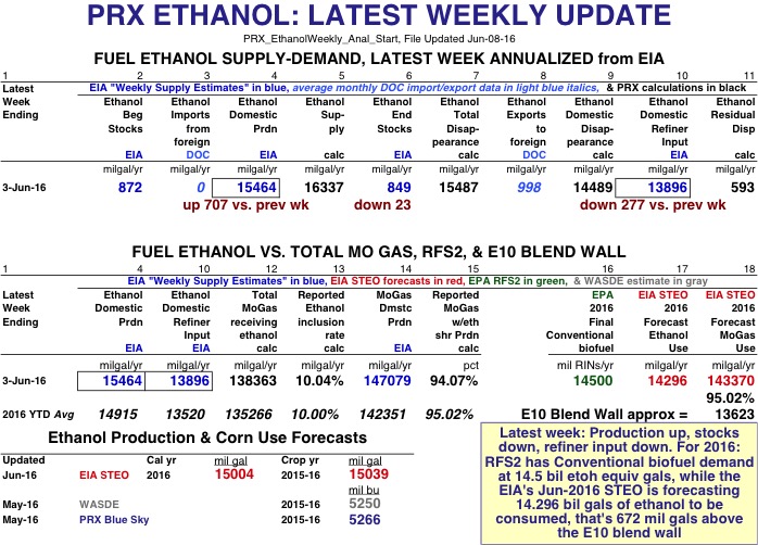 Page 2 has PRX's calculation using EIA's weekly estimates and DOC import/export data for the 2016 year-to-date annualized average of ethanol domestic disappearance at 13.954 bil gals vs EIA's June STEO forecast of 14.296 bil gals. Yet, EIA's 2016 YTD annualized average of weekly estimates of domestic refiner and blender net input of fuel ethanol is only 13.52 bil gals, leaving a residual disappearance of 434 mil gals.