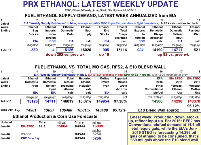EIA Weekly Data: For the latest week ending 1-Jul-16, ethanol production was 15.126 billion gallons annualized, down 292 mil gals from the previous week--and with a weekly residual error of -521 mil gals. Refiner input was 14.711 bil gals annualized setting another new record high, up 92 mil gals from last week, and the calculated inclusion rate for the 146.019 bil gals of mogas receiving ethanol was 10.07%. About 97.38% of all mogas (with 149.954 bil gals annualized) did indeed receive ethanol. Ethanol stocks were up 16 mil gals on the week to end at 905 mil gals.