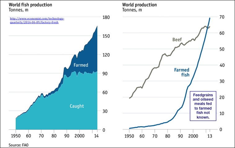 Aquaculture, another Critical Development. In column g below, I give a preliminary estimate of per capita use of fish food in China and the world. This is real guesswork. The UN-FAO database is enormously complex, with dozens of species and dozens of fishing regions--caught and/or "produced." We have no good data as yet on how much grains and oilseeds goes into "fish farming," but you can tell from the chart below that the volume is likely to be important, let's say especially in the South China Sea!
