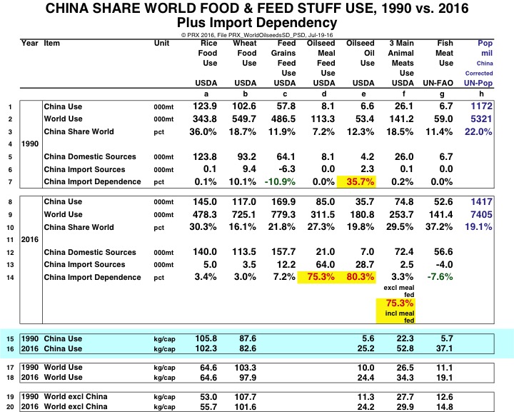 The correct numbers are shown in the repeated table below. All of the tonnage data from USDA's official PSD files are correct as previously presented, and the calculated inferences about the percent "import dependencies" of China by food class are unchanged and (thought to be) correct. In the new table below, I have begun to list some per capita data on the food classes, but we'll come to that in a moment, and present important details on subsequent Notes.