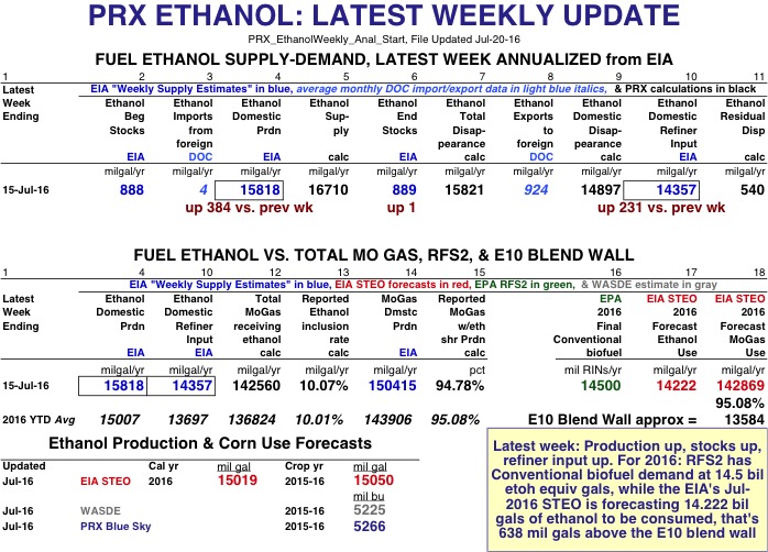 EIA Weekly Data: For the latest week ending 15-Jul-16, ethanol production was 15.818 billion gallons annualized, up 384 mil gals from the previous week--and with a weekly residual error of 540 mil gals. Refiner input was 14.357 bil gals annualized, up 231 mil gals from last week, and the calculated inclusion rate for the 142.56 bil gals of mogas receiving ethanol was 10.07%. About 94.78% of all mogas (with 150.415 bil gals annualized) did indeed receive ethanol. Ethanol stocks were up 1 mil gals on the week to end at 889 mil gals.