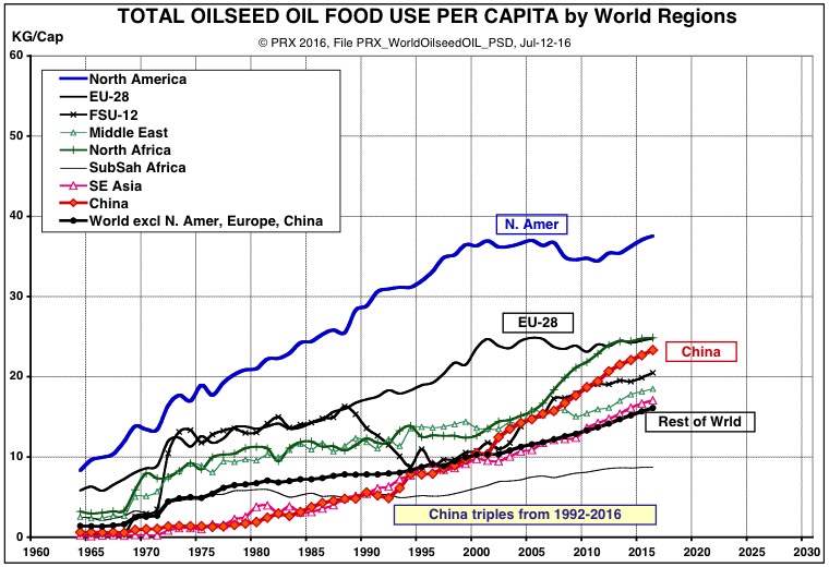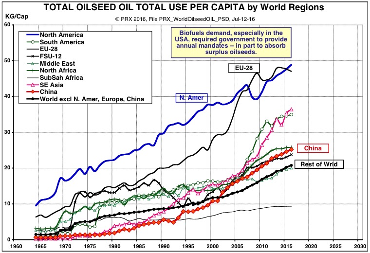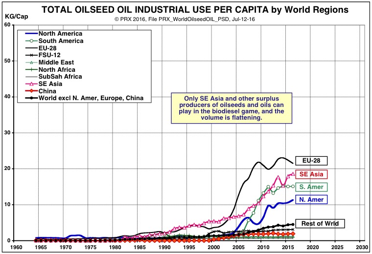The second chart shows that China's per capita use of vegetable oils for fuel has not changed much at all in recent years, and that the big increases are in the surplus producers of oilseeds (North America and South America with soybeans, and Europe with rapeseed) and other oils such as palm oil (in Indonesia and the rest of Southeast Asia). The volume of the big biodiesel players is flattening, especially in the past year or more of lower crude oil price.