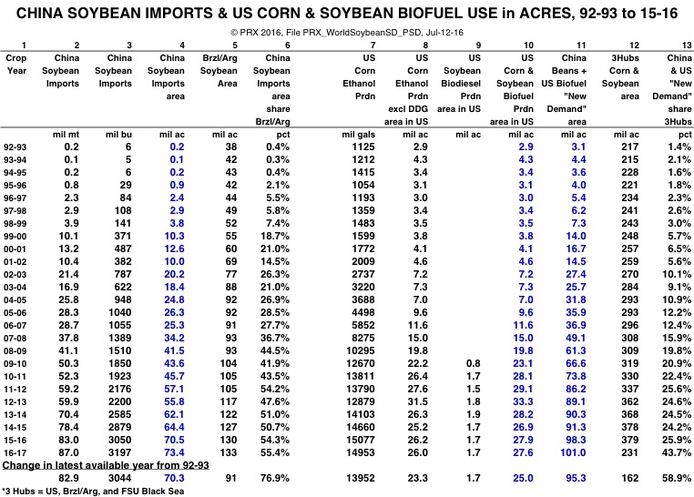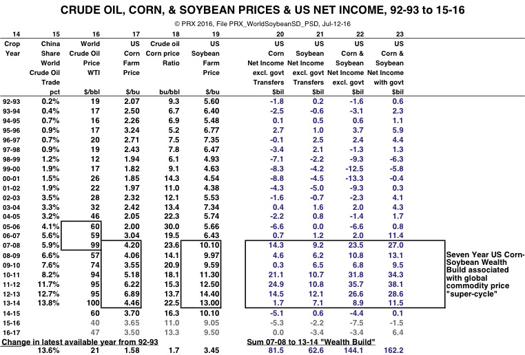 Look at columns 4, 5, and 6, the area planted requirements, given in million ACRES. Compare this with the area for corn ethanol in column 8. Look at column 15, China's share of world crude oil trade, and column 16, the world price of crude oil. Finally, note the overall impact of the "China Episode" on US corn-soybean net income in columns 20-23: a "wealth build" in seven years of over $150 billion. Something which has never happened in the history of the American cornbelt!