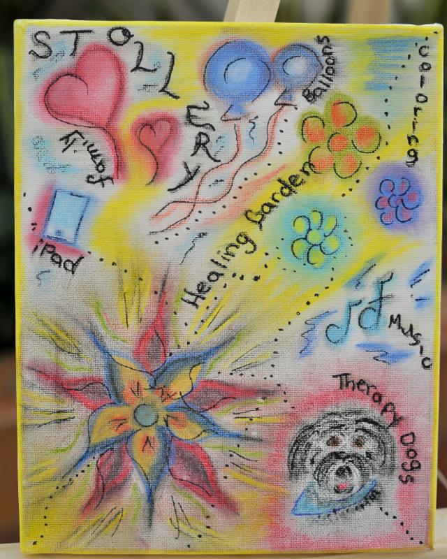 On April 15th, Child Life Specialists from the Stollery presented an exhibit of patients' artwork in the atrium. Child Life Specialists felt the inspiration for the exhibit came from a former patient, Haley Klak, who passed away in 2008 but had dreamed of being a Child Life Specialist. The exhibit, "A Journey through the Stollery", showcased art from a child's perspective as they journey through the hospital. Child Life Specialists help children cope with their illness and their experience at the hospital through different strategies such as art, music, and play. Each piece of artwork is a message from a child or their family - a delightful way to celebrate the wonderful role Child Life plays in the support of patients at the Stollery. To learn more or hear from some of the patients who exhibited artwork, you can watch it on CBC or read more about it on Alberta Health Services website. The beautiful pieces of art throughout this e-newsletter are just a few of the submissions from the exhibit. We are so privileged to have so many patients share their journey and their talents with us.