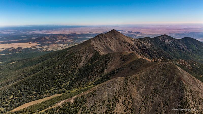 In the foreground lower right is Agassiz Peak which at 12,360' is the second highest peak in Arizona topped only by Humphreys Peak at 12, 633', which is above it following the ridgeline; about half way going up the ridgeline you can see where the trail to Humphreys Peak comes from below. Snow Bowl ski area is just over the ridge line that goes from the bottom left of the image up to Agassiz Peak and you can see some of the ski runs. To the right of the main ridgeline is the inner basin and following it down slope and not visible is Lockett Meadow. I ducked into the inner basin to get some shots, but after getting my head thumped on the canopy a couple of times I gave it up ... winds at the peaks were around 25kts and I knew it could be a little messy behind the peaks ... oh well.